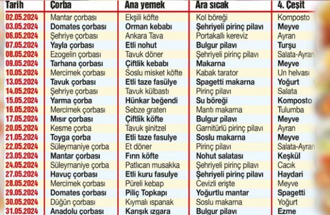 Sözcü’den Deniz Ayhan’ın haberine göre, son olarak tasarruf planının açıklandığı günlerde 5 yıldızlı otelde konferans vermesiyle gündem olan Diyanet’in yemek listesi ortaya çıktı. Diyanet’in listesinde sebze yemeklerinin olduğu günlerinde dahi yemeğin içinde et olması dikkat çekti.