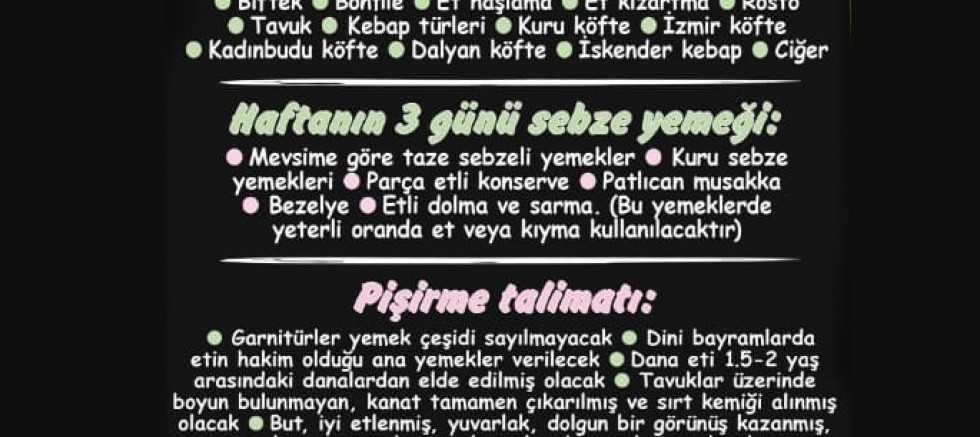 Haftanın üç gününde de mevsime göre taze sebzeler, kuru sebze yemekleri parça etli konserve ya da taze sebze yemekleri, bezelye, patlıcan musakka, etli dolma ve sarmalar vb. (bu yemeklerde de yeterli oranda et veya kıyma kullanılacaktır) verilecek. Garnitürler yemek çeşidi sayılmayacaktır. Kuru gıdalar, piyasanın en iyisi ve lezzetli cinsinden olacak. Makarna ve böreklerde beyaz peynir veya kaşar kullanılacak.”
