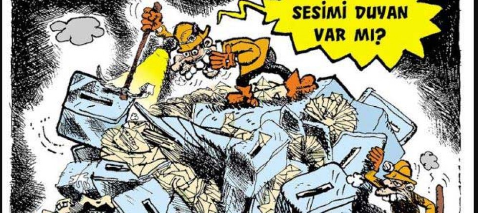6 Şubat depremlerine atıf yapılan Leman’ın kapak karikatüründe “22 yıllık AKP iktidarı ilk seçim yenilgisini alarak 31 Mart Yerel Seçimleri’ni büyük bir farkla CHP’nin ardından ikinci sırada tamamladı” ifadeleri yer aldı.