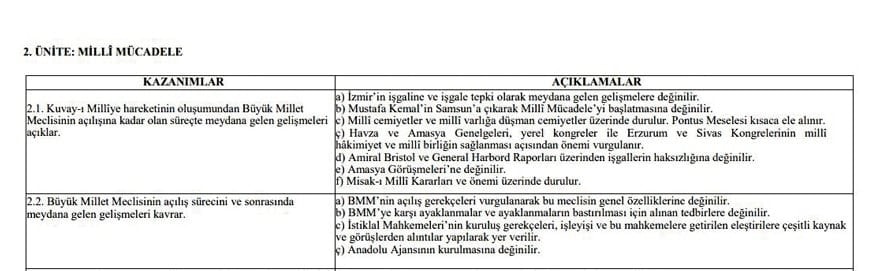 Dersin birinci ünitesinde öğrencilere, Atatürk’ün I. Dünya Savaşı’na kadarki yaşamı ile Osmanlı Devleti’nin durumunu analiz ettirme hedefi bulunuyor. Skandal ise “Millî Mücadele” başlıklı ikinci ünitede ortaya çıktı. Raporda, “YKS 2026’ya girecek aday öğrenciler, Büyük Millet Meclisi’nin (BMM) açılış süreci ve sonrasındaki olayları kavrar” ifadesi yer aldı. 581 sayfalık dokümanın tamamında “BMM” kullanılırken “Türkiye” kelimesinin çıkarıldığı görüldü.