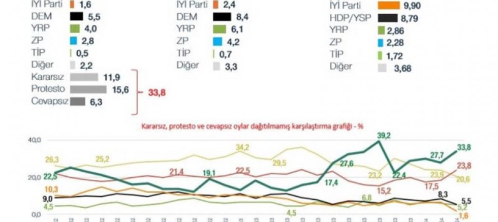 Kararsızlar dağıtıldığında ise 14 Mayıs 2023 Genel Seçimleri'nde 25,41 oy alan CHP'nin oyu 35,9, 35,32 oy alan AKP'nin oyu ise 31,1 olarak belirlendi. CHP, 31 Mart 2024 Yerel Seçimlerinde 37,7 oy oranına ulaşarak birinci parti olmuştu. Yapılan ankette kararsızların dağıtıldığı oranlara göre DEM Parti, 8,4 ile 3'üncü, MHP 7,9 ile 4'üncü, YRP 6,1 ile 5'inci, Zafer Partisi ise 4.2 ile 6'ıncı parti oldu.